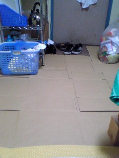 決して河川敷のダンボールハウスの1部屋ではない。はじめは新聞紙を敷くことを考えたが、新聞購読をしていないので手持ちがなかった。そこでいつものように粗大ごみ置き場からダンボールをかっぱらってきたわけである。